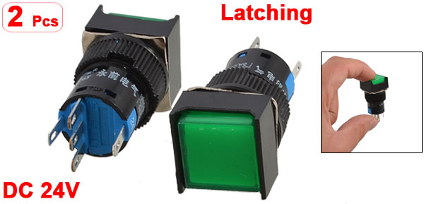 2 Pcs DC 24V Green Light Square Cap SPDT 5P Self Locking 16mm Push Button Switch