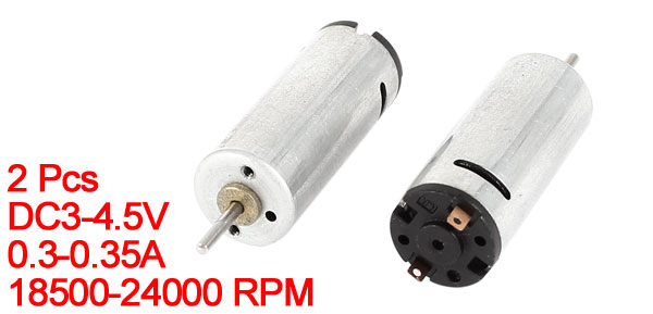 Product Name DC Motor Rated Voltage DC3-4.5V Current 0.3-0.35A Speed 18500-24000 RPM Shaft Size 9.5x1.5mm/ 0.4" x 0.06" Body Size 12 x 30mm/ 0.47" x 1.2" (D*H) Main Color Silver Tone Material Metal Net Weight 31g Package 2 x DC Motors - Reviews