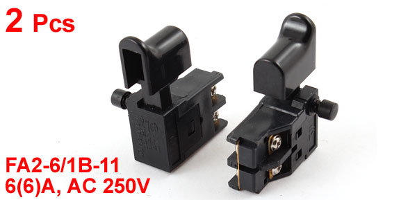 Product Name Trigger Switch Model No. FA2-6/1B-11 Action Type SPDT, Normally Open Lock Type Lock On Technical Parameter 6(6)A, AC 250V, 5E4 Screw Terminal Diameter 3mm/0.11'' Size 5.2 x 2.6 x 2.9cm/2'' x 1'' x 1.1'' (L*W*H) Material Plastic Color Black Weight 40g Package 2 x Trigger Switch - Reviews