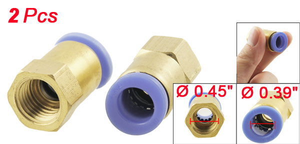 Item Name Pneumatic Fitting Total Size 29 x 17mm/1.14" x 0.67"(L*Max.D) Female Thread Diameter 11.6mm/0.45" Fit Tube Outer Diameter 10mm/0.39" Material Metal, Plastic Color Brass Tone, Blue Weight 40g Package Content 2 x Pneumatic Fitting - Reviews