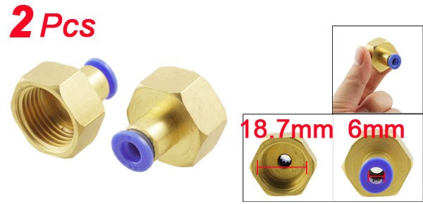 Item Name Pneumatic Fitting Total Size 26 x 24mm/1.02" x 0.94"(L*Max.D) Female Thread Diameter 18.7mm/0.736" Fit Tube Outer Diameter 6mm/0.236" Material Metal, Plastic Color Brass Tone, Blue Weight 50g Package Content 2 x Pneumatic Fitting - Reviews