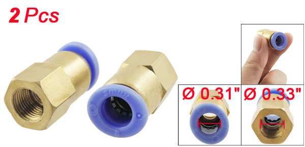 Item Name Pneumatic Fitting Total Size 26 x 14mm/1.02" x 0.55"(L*Max.D) Female Thread Diameter 8.5mm/0.33" Fit Tube Outer Diameter 8mm/0.31" Material Metal, Plastic Color Brass Tone, Blue Weight 30g Package Content 2 x Pneumatic Fitting - Reviews