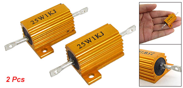 Product Name Aluminum Housed Wire wound Resistor Resistance Value 1K Ohm Power Rating 25W Resistance Tolerance ± 5% (J) Body Size 2.7 x 1.5cm / 1.1" x 0.6" (L*D) Total Size 5.5 x 2.8 x 1.5cm / 2.2" x 1.1" x 0.6" (L*W*H) Casing Material Aluminum Color Gold Tone Weight 27g Package Content 2 x Aluminum Housed Wirewound Resistors - Reviews