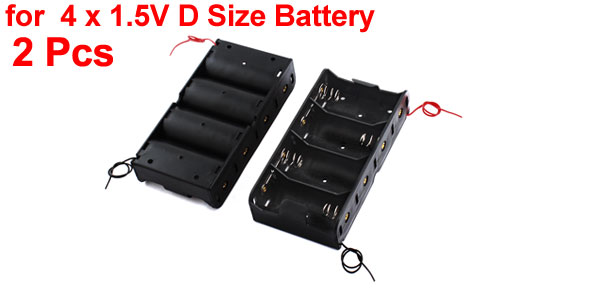 Main Color Black Fit for 4 x 1.5V D Size Battery (Not Included The Battery) Net Weight 84g Country of Manufacture CHINA Package Content 2Pcs Battery Holder Material Plastic, Metal Total Size 13.5 x 7 x 3.3cm/5.3" x 2.8" x 1.3"(L*W*H) Wire Length 13.5cm/5.3" Battery Connect Type In Series - Reviews