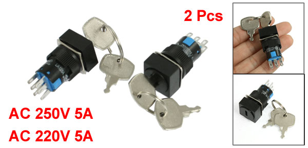 2 Pcs Keylock Rotary Selector Square 2NO 2NC DPDT Push Button Switch AC 250V 5A