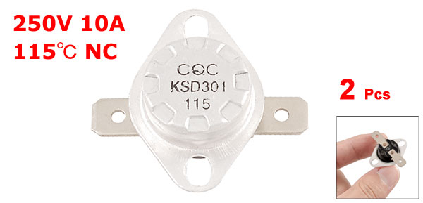 Product Name Temperature Switch Thermostat Model No. KSD301 Action Type Normal Close (N.C.) Action Temperature 115C/239F Voltage 250V 10A Circuit Resistance 50 Mohm Insulation resistance 100 Mohm Size (Each) 3.4 x 1.2cm / 1.3" x 0.47" (L*H) Mounting Hole Spacing 2.4cm / 0.94" Material Metal, Ceramic Color Black, Silver Tone Net Weight 12g Package Content 2 x Temperature Switch Thermostat - Reviews