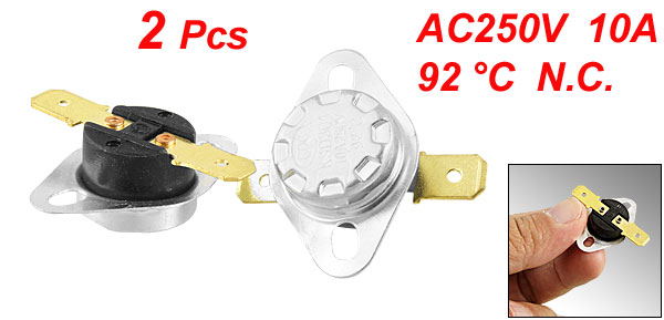 Product Name Themostat Model KSD301 Type NC(Normal Close) Action Temperature 92C/197.6F Voltage 10A, AC250V Circuit Resistance <50 Mohm Insulation resistance 100 Mohm Size(Each) 3.5 x 1.1cm/1.37" x 0.43"(L*H) Material Metal, Plastic Color Black, Silver Tone Net Weight 8g Package Content 2 x Temperature Switch Themostat - Reviews