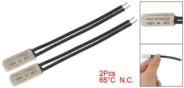 Product Name Temperature Control Switch Material Plastic, Bimetal Model KSD9700 Type NC(Normal Close) Contact Capacity 250V 5A Max Rated Disconnection Temperature 65 °C/149°F Active Temperature 65 ± 5 °C Reset Temperature 45 ± 10 °C Color Black, Silver Tone Contact Stick Length 70mm/2.9" Head Size 20 x 7 x 3mm/0.8" x 0.3" x 0.1"(L*W*T) Weight 8g Package Content 2 x Temperature Control Switch - Reviews