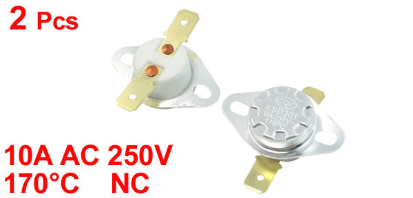 Product Name Ceramic Thermostat Model.No KSD301 Action Type NC Action Temperature 170C Voltage 10A AC 250V Size(Each) 3.3 x 3.3 x 1.3cm/1.3" x 1.3" x 0.51"(L*T) Material Metal, Ceramic Color White, Gold Tone, Silver Tone Net Weight 15g Package Content 2 x Ceramic Thermostat - Reviews