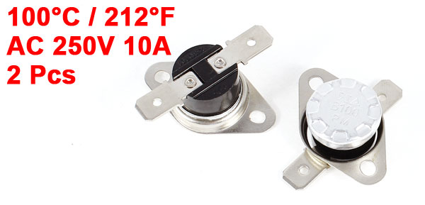 Product Name Temperature Switch Thermostat Model No. B100 Action Type Normal Close (N.C.) Action Temperature 100°C / 212°F Voltage AC 250V 10A Size (Each) 3.4 x 1.2cm / 1.3" x 0.47" (L*H) Mounting Hole Spacing 2.4cm / 0.94" Material Metal, Plastic Color Black, Silver Tone Net Weight 10g Package Content 2 x Temperature Switch Thermostat  - Reviews