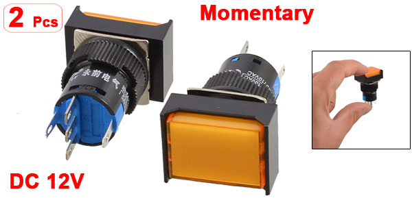 Product Name Push Button Switch Model No. LA128AJ-11D Action Type Momentary Contact Type 1NO, 1NC, SPDT Light Voltage DC 12V Rating Voltage AC 110V 5A Ith AC 110V 5A Light Color Orange Shell Color Black, Orange, Blue Terminals Quantity 5 Pins Mounting Hole Diameter 16mm / 0.63" Overall Size (Approx) 23 x 18 x 40mm/ 0.9" x 0.7" x 1.6" (L*W*T) Weight 17g Package Content 2 Pcs x Push Button Switch - Reviews