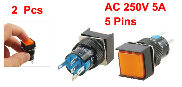 Product Name Push Button Switch Action Type Self Locking Contact Type 1 NO, 1NC (SPDT) Switch Voltage Current AC 250V 5A Ith AC 220V 5A Light Voltage DC 12V Terminals Quanlity 5 Pins Mounting Hole Diameter 15.7mm / 0.618" Button Size 15 x 15mm / 0.6" x 0.6"(L*W) Overall Size 17.5 x 17.5 x 39mm / 0.7" x 0.7" x 1.5"(L*W*H) Material Plastic & Metal Light Color Orange Color Orange & Black Weight 15g Package Content 2 x Push Button Switch - Reviews