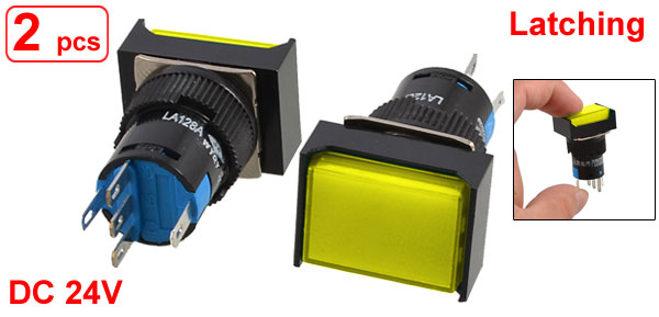 2 Pcs Panel Mount Yellow Lamp Latching Rectangle Push Button Switch DC 24V