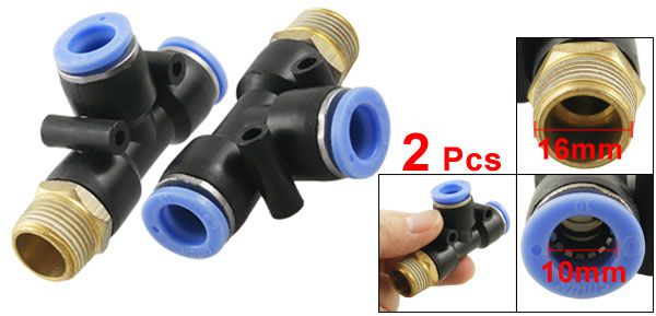 Product Name Pneumatic Quick Fittings Type T Connector One Touch Connector 10mm/ 0.39" Male Thread Connector 16mm/ 0.63" Thread Size 3/8" Material Plastic, Metal Dimension (Approx) 6.3 x 3.5 x 1.6cm/ 2.5" x 1.37" x 0.63" (L*W*T) Color Black, Blue Weight 69g Package Content 2 x Pneumatic Quick Fittings - Reviews