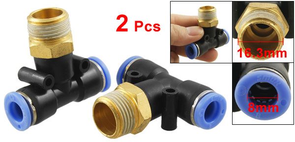 2 Pcs Pneumatic 3/8" Thread 8mm One Touch Push In T Joint Quick Fittings