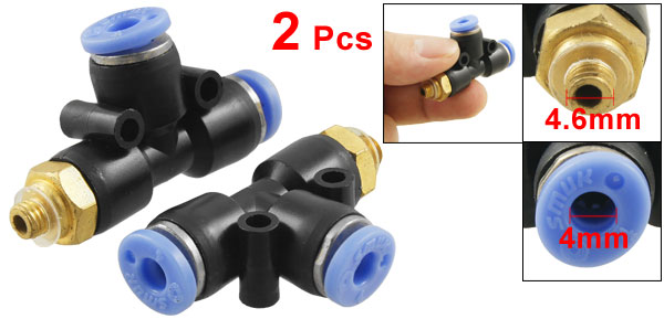 Product Name Pneumatic Quick Fittings Type T Connector One Touch Connector 4mm/ 0.16" Male Thread Connector 4.6mm/ 0.18" Material Plastic, Metal Dimension (Approx) 4 x 2.5 x 1.1cm/ 1.57" x 1" x 0.4" (L*W*T) Color Black, Blue Weight 19g Package Content 2 x Pneumatic Quick Fittings - Reviews