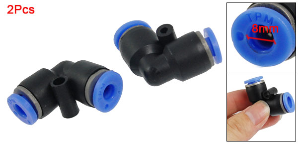 Product Name Pneumatic Quick Fittings Type 8mm to 8mm ( Right Angle) Material Plastic One Touch End Diameter 8mm Dimension (Approx) 2.8 x 2.8 x 1.6cm/ 1.1" x 1.1" x 0.63" (L*W*H) Color Black, Blue Weight 17.2g Package Content 2 x Pneumatic Quick Fittings - Reviews
