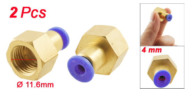 Item Name Pneumatic Fitting Total Size 24 x 17mm/0.94" x 0.67"(L*Max.D) Female Thread Diameter 11.6mm/0.45" Fit Tube Outer Diameter 4mm/0.157" Material Metal, Plastic Color Brass Tone, Blue Weight 34g Package Content 2 x Pneumatic Fitting - Reviews