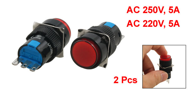 2 Pcs Red Round Cap 3P SPDT Latching 16mm Push Button Switch AC 250V 5A Amp