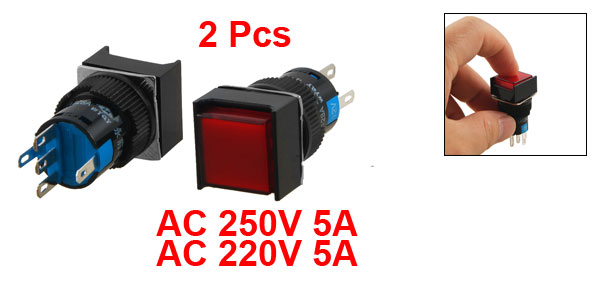 Product Name Push Button Switch Action Type Self Locking Contact Type 1 NO, 1NC (SPDT) Switch Voltage Current AC 250V 5A Ith AC 220V 5A Light Voltage DC 12V Terminals Quanlity 5 Pins Mounting Hole Diameter 15.7mm / 0.618" Button Size 15 x 15mm / 0.6" x 0.6"(L*W) Overall Size 17.5 x 17.5 x 39mm / 0.7" x 0.7" x 1.5"(L*W*H) Material Plastic & Metal Light Color Red Color Red & Black Weight 15g Package Content 2 x Push Button Switch - Reviews