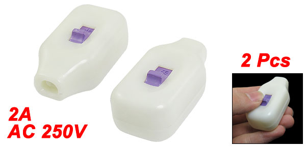 Product Name In Line Cord Switch Rating Power AC 250V 2A Material Plastic Size 5.7 x 3 x 2.1cm / 2.2" x 1.2" x 0.8" (L*W*T) Main Color White, Purple Net Weight 32g Package Content 2 x In Line Cord Switch - Reviews