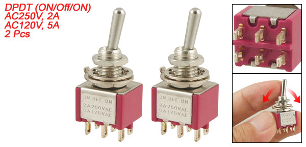 Details2 Pcs Solder Lug Terminals DPDT On/Off/On Toggle Switch  Product Name Toggle Switch Material Metal & Plastic Type DPDT (ON/Off/ON) Thead Dia(Approx) 0.6cm / 0.236" Power AC250V, 2A AC120V, 5A Overall Size(Approx) 1.2 x 1.1 x 3.2cm / 0.5" x 0.4" x 1.3"(L*W*H) Color Red & Silver Tone Weight 14g Package Content 2 Pcs x ON/Off/ON Toggle Switch