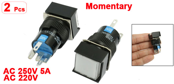 Item Name Push Button Switch Contact Type 1NO, 1NC Switch Type Momentary Type Switch Working Voltage AC 250V, 5A Lamp Voltage AC 220V Thermal Current(Ith) AC 220V 5A Lamp Cap Color White Switch Color Black, White Pin Number 5 Button Size 15 x 15mm/0.6" x 0.6" (L*W) Mounting Thread Dia. 16mm/ 0.63" Total Size 17 x 17 x 40mm/ 0.7" x 0.7" x 1.6"(L*W*H) Material Plastic, Electronic Parts Weight 16g Package Content 2 x Push Button Switch - Reviews
