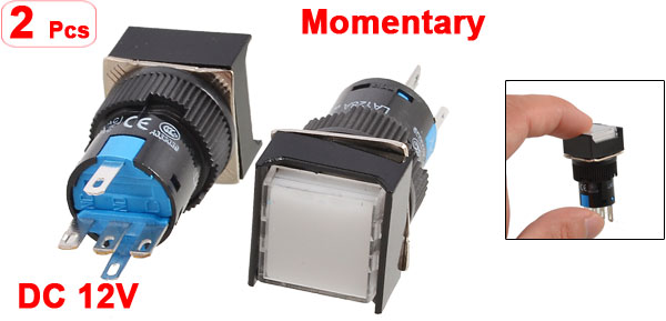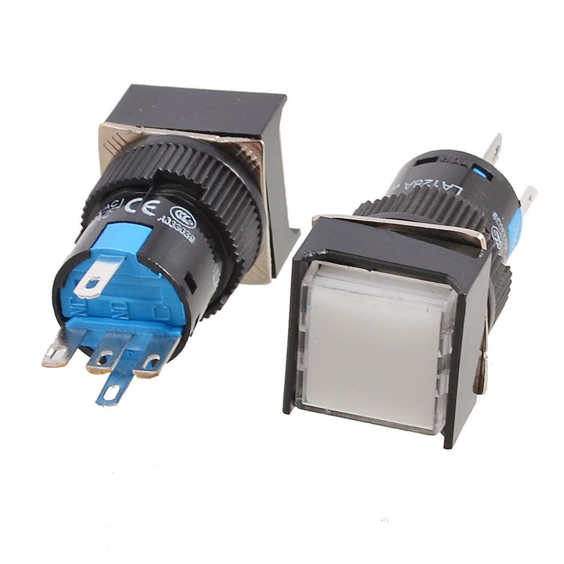 Product Name Push Button Switch Model No. LA128F-11D Action Type Momentary Contact Type 1NO, 1NC, SPDT Light Voltage DC 12V Rating Voltage AC 250V 5A Ith AC 220V 5A Shell Color Black, White, Blue Terminals Quantity 5 Pins Mounting Hole Diameter 16mm / 0.63" Overall Size (Approx) 17 x 17 x 40mm/ 0.67" x 0.67" x 1.6" (L*W*T) Weight 16g Package Content 2 Pcs x Push Button Switch - Reviews