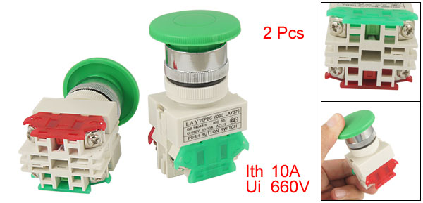 2 Pcs x AC 660V 10A Green Sign Momentary Mushroom Push Button Switch 1 N/O 1 N/C