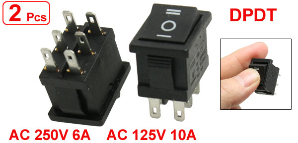 Details2 pcs x DPDT ON-OFF-ON 3 Position Snap In Boat Rocker Switch 6A/250V 10A/125V AC  Product Name Rocker Switch Poles DPDT Terminals 6 Pin (On-Off-On) Rating Voltage AC 250V 6A AC 125V 10A Total Size(Each One) 2.1 x 1.5 x 2.5cm/ 0.82" x 0.6" x 1"(L*W*T) Mounting Size 1.8 x 1.3 x 2cm/ 0.7" x 0.5" x 0.78"(L*W*T) Color Black Material Plastic, Metal Total Weight 11g Package Content 2 x Rocker Switch