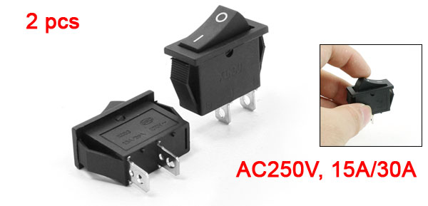 Details2 Pieces 2 Pin Terminals SPST I/O 2 Position Rocker Switch AC 250V 15A 30A  Item Name Rocker Switch Type On/ Off (SPST) Voltage & Current AC250V, 15A/30A Overall Size 4.7 x 3.1 x 1.4cm / 1.9"x 1.2" x 0.55" (L*W*H) Mount Hole Size 2.7 x 1 x 2.8cm/1" x 0.39" x 1.1"(L*W*H) Color Black, Silver Tone Material Plastic & Metal Total Net Weight 12g Package Content 2 x Rocker Switch