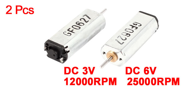 Product Name DC Motor Rated Voltage DC 3V DC 6V Speed 12000RPM 25000RPM Current 0.02A 0.03A Locked Rotor 0.27A 0.52A Output Shaft Diameter 1mm/0.039" Output Shaft Length 7.5mm/0.3" Motor Length 20mm/ 0.8" Motor Thickness 6mm/0.24" Motor Width 8mm/0.31" Main Color Gray Material Metal Weight 8g Package 2 x DC Motors - Reviews