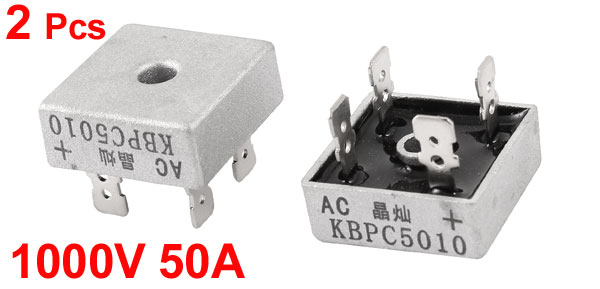 Product Name Bridge Rectifier Voltage 1000V Current 50A Dimension 2.9 x 2.9 x 1cm/1.14" x 1.14" x 0.4"(L*W*H) Pin Length 1.1cm/0.43" Material Ceramic, Metal Color Black, Silver Tone Net Weight 37g Package Content 2 x Bridge Rectifier - Reviews