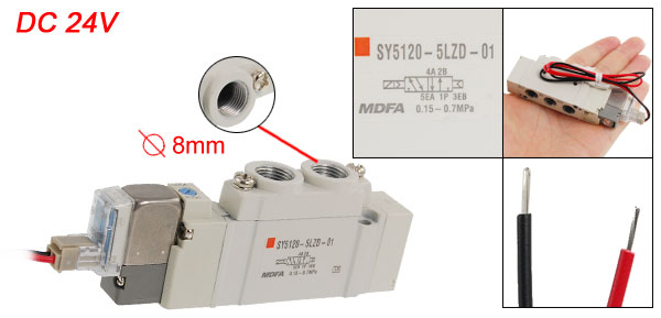 Product Name Solenoid Valve Model No. SY5120-5LZD-01 Actuation Type 2 Position Single Pilot Type Internal Piloted Lead Wire L Plug Connector w Lead Wire Wire Length 29cm / 11.4" Rated Voltage DC 24V Thread Port Size 8mm / 0.315" Operating Pressure Rage 0.15-0.7MPa Surge Suppressor Type Light & Surge Voltage Suppressor Manual Override Style Push-turn Locking Lever Overall Size 9.5 x 1.5 x 3.3cm / 3.7" x 0.6" x 1.3"(L*W*H) Material Metal, Plastic Main Color Gray, Silver Tone Net Weight 70g Package Content 1 x Solenoid Valve - Reviews