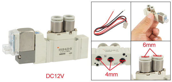 Product Name Solenoid Valve Model No. SY3120-6LZD-C6 Actuation Type 2 Position Single Pilot Type Internal Pilot Lead Wire L Plug Connector w Lead Wire Wire Length 29cm / 11.4" Rated Voltage DC12V Thread Port Size 4mm / 0.157" One-touch Fitting Port Size 6mm / 0.236" Operating Pressure Rage 0.15-0.7MPa Surge Suppressor Type Light & Surge Voltage Suppressor Manual Override Style Push-turn Locking Lever Overall Size 7.7 x 1 x 3.7cm / 3" x 0.4" x 1.4"(L*W*H) Material Metal & Plastic Color Gray & Silver Tone Net Weight 58g Package Content 1 x Solenoid Valve - Reviews