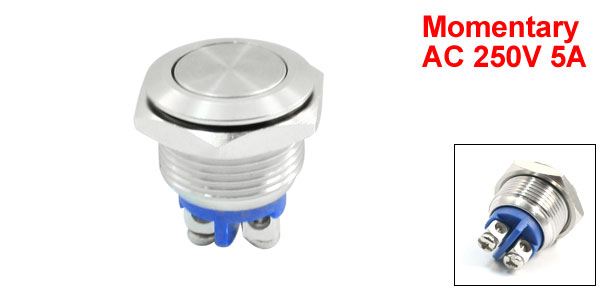 Item Name Push Button Switch Action Type Momentary Type Head Shape Round Flat Head Contact SPST(ON/OFF ) Switch Rating 250VAC 5A Terminals Number 2 Thread Diameter 16mm/0.63" Total Size 22 x 19mm/ 0.87" x 0.75"(L*Max.W) Material Metal, Plastic, Electric Parts Housing Color Silver Tone Weight 13g Package Content 1 x Push Button Switch - Reviews