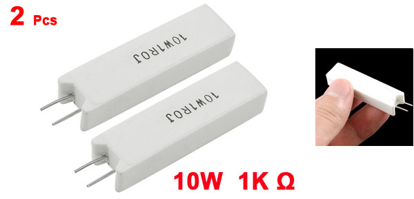 Product Name Cement Resistor Body Material Ceramic, Cement Power 10W Resistance 1K Ohm Tolerance ±5% Body Size (Approx.) 50 x 13 x 9mm/2'' x 0.5'' x 0.35'' (L * W * H) Pin Size (Approx.) 10 x 0.75mm / 0.39'' x 0.03"(L*D) Pin Spacing 5mm/0.2'' Color White Weight 27g Package Content 2 x Cement Resistors - Reviews