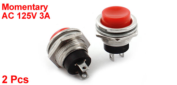 Item Name Push Button Switch Action Type Momentary Contact Type SPST Working Voltage Current AC 125V 3A Button Shape Round Shaped Button Diameter 13mm/0.51" Mounting Diameter 16mm/0.63" Total Size 20 x 22mm/0.79" x 0.87"(H* Max.D) External Material Plastic, Metal Color Red, Black Net Weight 18g Package Content 2x Push Button Switches - Reviews