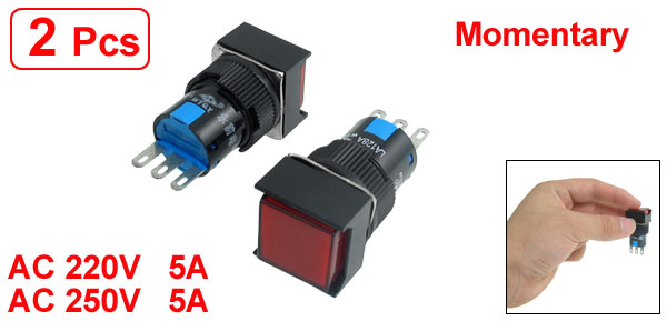 Item Name Push Button Switch Type Momentary, 1NO 1NC Ith AC 220V, 5A Voltage AC 250V, 5A Button Color Red Button Size 15 x 15mm/0.6'' x 0.6''(L*W) Thread Diameter 15.6mm/0.61'' Size 17 x 17 x 39mm/0.7'' x 0.7'' x 1.5''(L*W*H) Material Plastic, Metal Weight 14g Package Content 2 x Push Button Switch - Reviews
