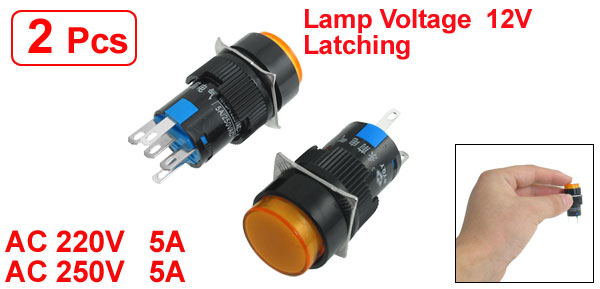 Item Name Push Button Switch Contact Type 1NO, 1NC Switch Type Latching Type Switch Working Voltage AC 250V, 5A Lamp Voltage 12V Thermal Current(Ith) AC 220V 5A Lamp Cap Color Orange Switch Color Black, Orange Pin Number 5 Button Cap Diameter 15mm/ 0.59" Mounting Thread Dia. 15.6mm/ 0.61" Total Size 18 x 18 x 41mm/ 0.71" x 0.71" x 1.6"(L*W*H) Material Plastic, Electronic Parts Weight 15g Package Content 2 x Push Button Switch - Reviews
