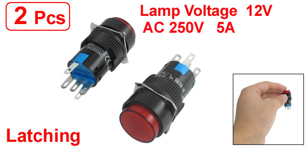 Item Name Push Button Switch Contact Type 1NO, 1NC Switch Type Latching Type Switch Working Voltage AC 250V, 5A Lamp Voltage 12V Thermal Current(Ith) AC 220V 5A Lamp Cap Color Red Switch Color Black, Red Pin Number 5 Button Cap Diameter 15mm/ 0.59" Mounting Thread Dia. 15.6mm/ 0.61" Total Size 18 x 18 x 41mm/ 0.71" x 0.71" x 1.6"(L*W*H) Material Plastic, Electronic Parts Weight 15g Package Content 2 x Push Button Switch - Reviews