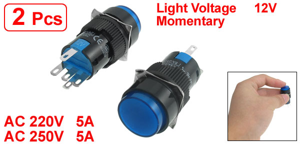 Item Name Push Button Switch Type Momentary, 1NO 1NC Ith AC 220V, 5A Switching Voltage AC 250V, 5A Light Voltage 12V Light Color Blue Button Diameter 15mm/0.6'' Thread Diameter 15.2mm / 0.6'' Size 18 x 18 x 40mm/0.7'' x0.7'' x 1.6'' (L*W*H) Material Plastic, Metal Weight 15g Package Content 2 x Push Button Switch - Reviews