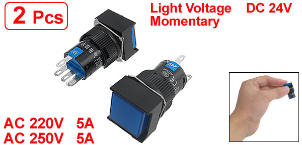 Item Name Push Button Switch Type Momentary, 1NO 1NC Ith AC 220V, 5A Switching Voltage AC 250V, 5A Light Voltage 24V Light Color Blue Button Size 15 x 15mm/0.6'' x 0.6''(L*W) Thread Diameter 15.2mm/0.6'' Size 17 x 17 x 40mm/0.7'' x 0.7'' x 1.5''(L*W*H) Material Plastic, Metal Weight 15g Package Content 1 x Push Button Switch - Reviews