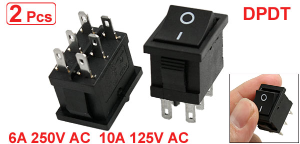 Details2 x AC 6A/250V 10A/125V 6 Pin DPDT ON/ON 2 Position Snap in Boat Rocker Switch  Product Name Rocker Switch Poles DPDT Terminals 6 Pin (On-On) Rating Voltage AC 250V 6A AC 125V 10A Total Size(Each One) 2.1 x 1.5 x 2.5cm/ 0.82" x 0.6" x 1"(L*W*T) Mounting Size 1.8 x 1.3 x 2cm/ 0.7" x 0.5" x 0.78"(L*W*T) Color Black Material Plastic, Metal Total Weight 10g Package Content 2 x Rocker Switch