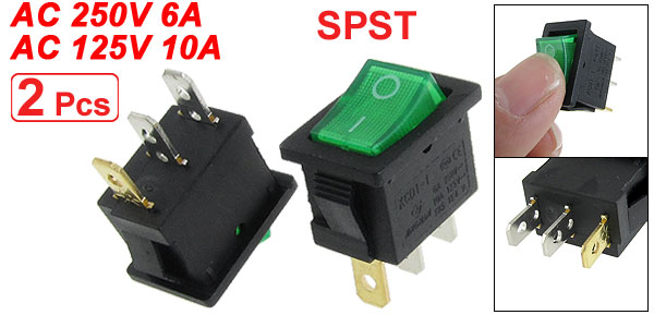 Details2 x AC 6A/250V 10A/125V Green Light ON-OFF SPST Snap In Boat Rocker Switch 3 Pin  Product Name Rocker Switch Model KCD1-1 Poles SPST Terminals 3 Pin (On - Off) Rating Voltage 6A 250V AC 10A 125V AC Total Size(Each One) 2.2 x 1.5 x 2.8cm/0.9'' x 0.6'' x 1.1'' (L*W*T) Mounting Dimension 1.9 x 1.2 x 2.1cm/0.7'' x 0.5'' x 0.8'' (L*W*Depth) Color Black, Green Material Plastic & Metal Total Weight 9g Package Content 2 x Rocker Switch