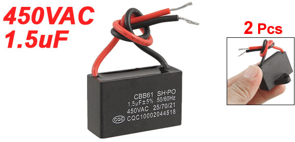 Product Name Motor Capacitor Housing Material Plastic Dielectric Material Metallized Polypropylene Film Model CBB61 Capacitance 1.5uF Tolerance ±5% Rated Voltage 450VAC Frequency 50/60Hz Ambient Temperature 25/70/21 Body Size (Each) 3.7 x 2.4 x 1.4cm / 1.4" x 0.9" x 0.55" (H * W * T) Wire Length 9cm/3.5" Color As Picture Shown Weight 27g Package Content 2 x Motor Capacitor - Reviews