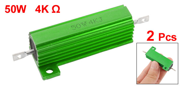 Product Name Aluminum Housed Resistor Resistance Value 4K Ω Power Rating 50W Resistance Tolerance ± 5% (J) Body Size 49 x 15mm/ 1.9" x 0.59" (L*D) Mounted Hole Size 1.8mm/ 0.07", 3mm/ 0.12" Total Size 72 x 22 x 15mm/ 2.8" x 0.86" x 0.59" (L*W*T) Casing Material Aluminum Color Green Weight 48g Package Content 2 x Aluminum Housed Resistor - Reviews
