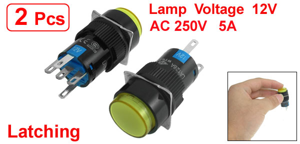 Details2 x DC 12V Yellow Neon Light 5P Latching 1NO 1NC Round 16mm Push Button Switch  Item Name Push Button Switch Contact Type 1NO, 1NC Switch Type Latching Type Switch Working Voltage AC 250V, 5A Lamp Voltage 12V Thermal Current(Ith) AC 220V 5A Lamp Cap Color Yellow Switch Color Black, Yellow Pin Number 5 Button Cap Diameter 15mm/ 0.59" Mounting Thread Dia. 16mm/ 0.63" Total Size 18 x 18 x 41mm/ 0.71" x 0.71" x 1.6"(L*W*H) Material Plastic, Electronic Parts Weight 15g Package Content 2 x Push Button Switch