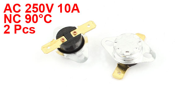 Details2 x KSD301 AC 250V 10A 90 Celsius NC 2Pin Temperature Switch Thermostat Sensor  Product Name Temperature Control Switch Thermostat Model.No KSD301 Action Type NC Action Temperature 90°C Voltage AC 250V 10A Size(Each) 3.4 x 3.2 x 1.2cm/1.3" x 1.3" x 0.5"(L*W*T) Mounted Size 5 x 3mm/0.2" x 0.12"(L*W) Mounting Hole Center Distance 2.3cm/0.9" Material Metal, Plastic Color Black, Silver Tone Net Weight 9g Package Content 2 x Temperature Control Switch Thermostat