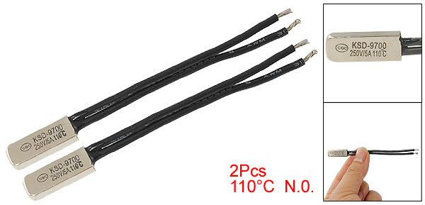 Product Name Temperature Control Switch Material Plastic, Bimetal Model KSD9700 Type NO(Normal Open) Contact Capacity 250V 5A Max Rated Disconnection Temperature 110C/230F Active Temperature 110 ± 5 °C Reset Temperature 75 ± 12 °C Color Black, Silver Tone Contact Stick Length 70mm/2.9" Head Size 20 x 7 x 3mm/0.8" x 0.3" x 0.1"(L*W*T) Weight 8g Package Content 2 x Temperature Control Switch - Reviews